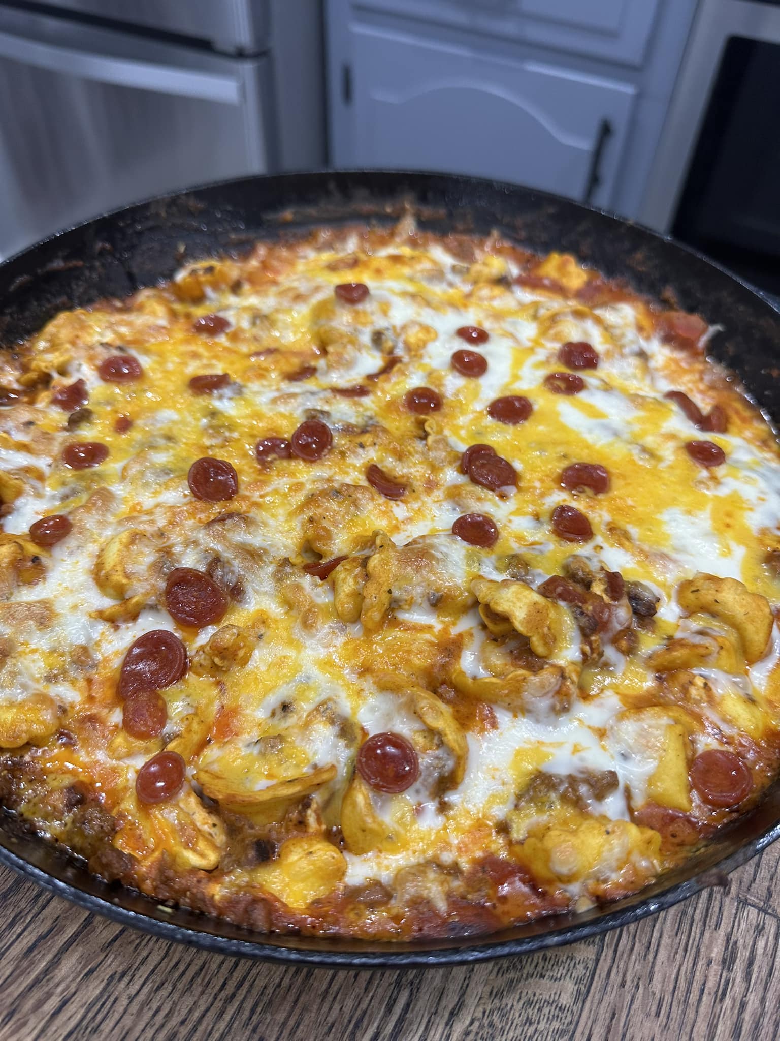 Ingredients 1 lb ground beef 1/2 tsp each of salt and pepper 1 tsp each of onion powder and Italian seasoning 1 TBSP minced garlic 1 24 oz jar of marinara sauce 19 oz frozen tortellini 1/2 block 4 oz of cream cheese Pepperoni Shredded cheese Instructions : Continue Reading in next page