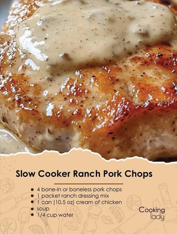 Slow Cooker Ranch Pork Chops Ingredients: 4 bone-in or boneless pork chops 1 packet ranch dressing mix 1 can (10.5 oz) cream of chicken soup 1/4 cup water Instructions: Read more on next page