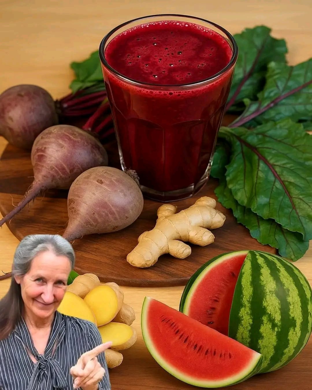 DescriptionThis vibrant  juice is a refreshing and nutrient-packed drink combining the natural sweetness of watermelon with the earthy richness of beets, the zing of fresh ginger, and the anti-inflammatory power of turmeric. Perfect for a summer detox, post-workout hydration, or as a daily immune booster, this juice balances flavor and health in every sip. Ingredients For Beet, Ginger,  Turmeric & Watermelon Juice2 cups fresh watermelon, cubed and deseeded1 medium beetroot, peeled and chopped1-inch fresh ginger root, peeled1-inch fresh turmeric root (or ½ tsp ground turmeric)½ lemon,  juiced (optional, for extra freshness)1 cup cold water (adjust for consistency)Ice cubes (optional)InstructionsWash and prepare all ingredients.Add watermelon, beet, ginger, turmeric, lemon juice, and water into a blender or juicer.Blend until smooth. If using a juicer, process everything directly.Strain through a fine mesh sieve or cheesecloth if you prefer a smoother juice.Pour into a glass over ice cubes and serve immediately.NotesFresh turmeric is best, but powdered works if unavailable.For a sweeter taste, add a small apple or a teaspoon of honey.Juice is best consumed