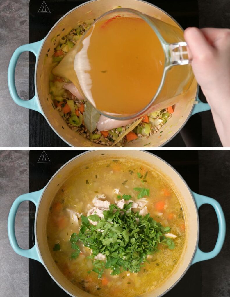 Bring the soup to a boil, then reduce the heat to low and let it simmer, covered, for about 45-50 minutes, or until the barley is tender and the chicken is cooked through.