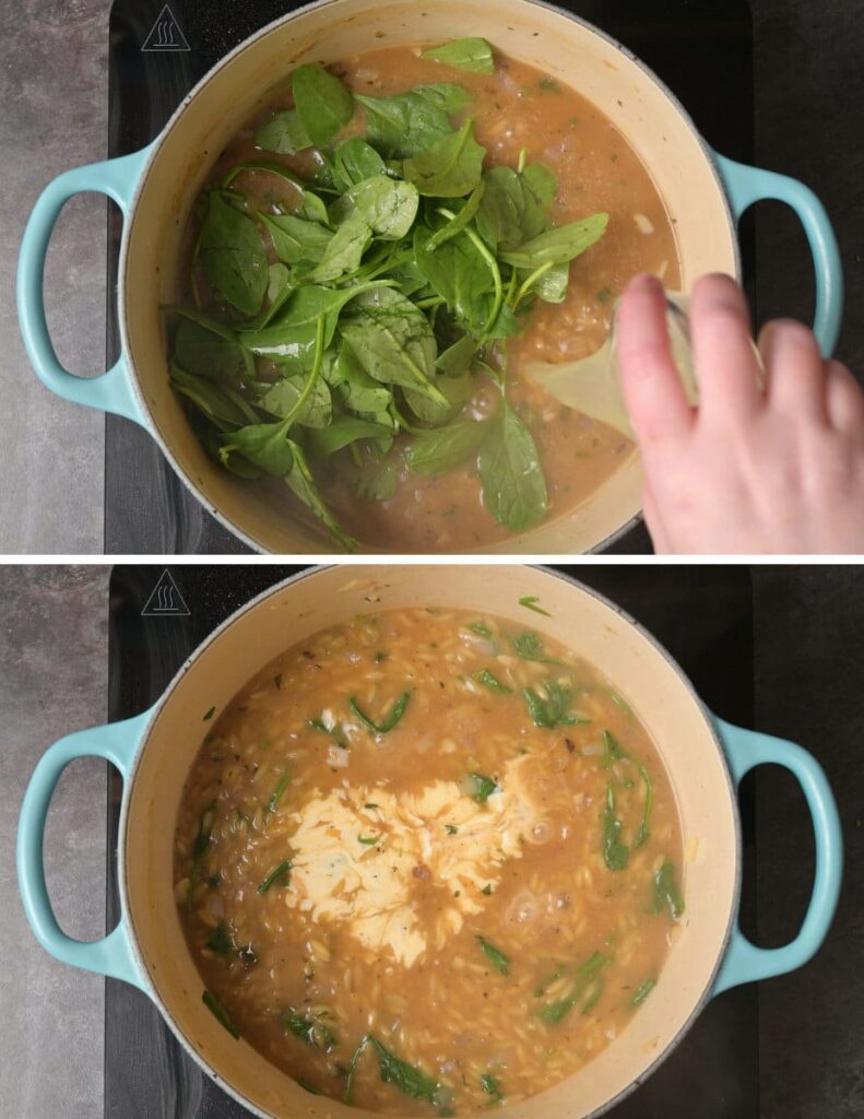 Stir in the baby spinach and lemon juice and simmer for 1-2 minutes until the spinach is wilted.