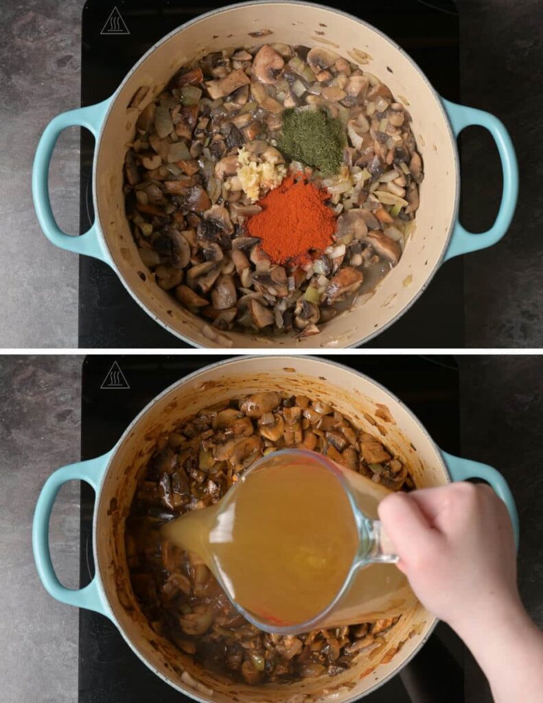 Add the sliced mushrooms to the pot and cook for about 5-10 minutes, or until they release their moisture and start to brown.