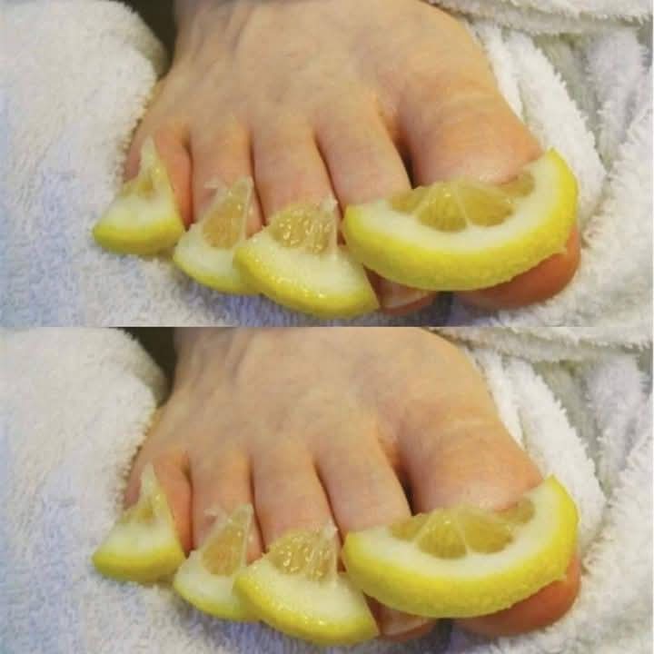 The image shows a home remedy using lemon slices placed around the toes. This method is often used to help with nail care, soften calluses, and provide relief for fungal infections or thick skin around the nails. Here’s a simple way to use it:Prepare Lemon Slices: Cut a fresh lemon into slices.Clean Your Feet: