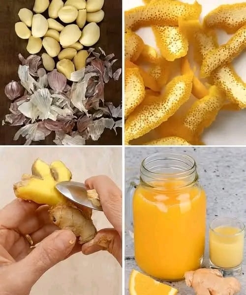 Wash and slice the ginger and lemon. Peel the garlic cloves.